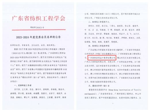 廣州紡織品進出口集團有限公司(以下簡稱“紡出公司”)在2024年廣東省紡織工程學會開展的2023-2024年度優(yōu)秀會員評選活動中,榮獲“標準化工作優(yōu)秀單位”稱號。關(guān)勇獲評為“標準化工作優(yōu)秀個人”,張菁、陳繼成、孫立大和高新武獲評為“優(yōu)秀科技工作者”。這一榮譽是對公司團隊專業(yè)能力和敬業(yè)精神的高度贊揚,也是激勵每一位員工繼續(xù)秉承匠心精神,不斷探索與實踐,為紡織行業(yè)的進步貢獻更多力量的巨大動力。